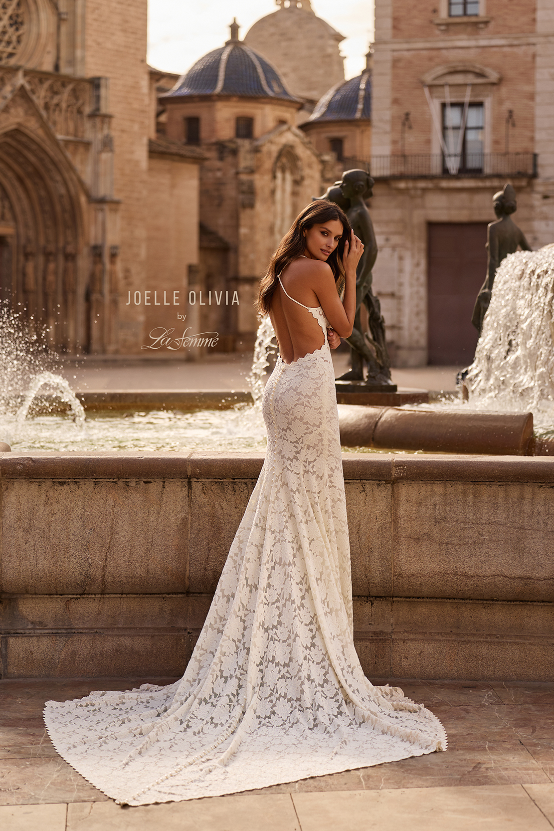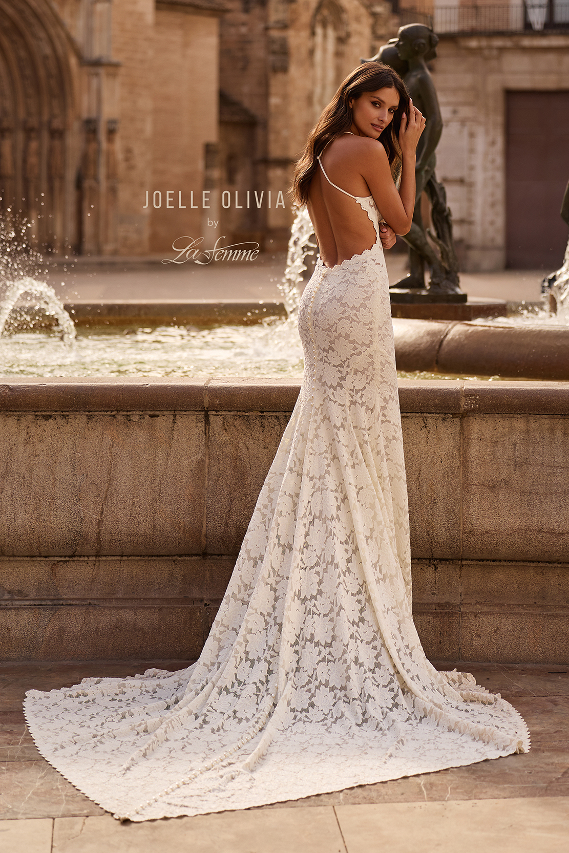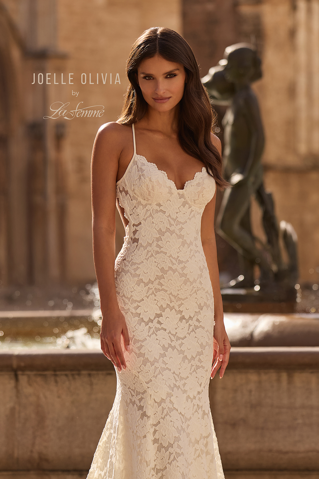 This romantic fit and flare gown is crafted entirely from soft floral lace for a timeless, feminine look. The delicate scalloped neckline and slim straps highlight the shoulders, while the daring low open back and sweeping train add a touch of modern allure to this classic lace silhouette. Back zipper closure.