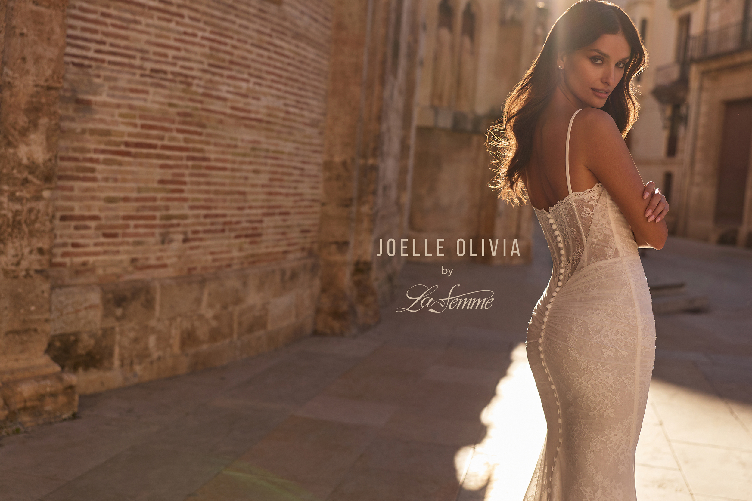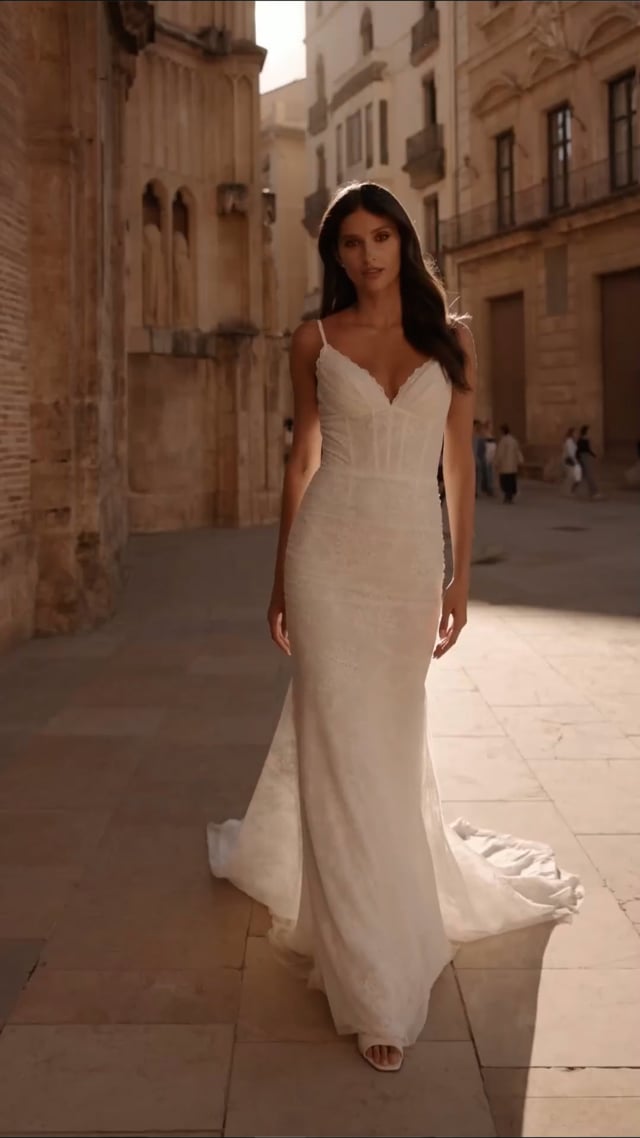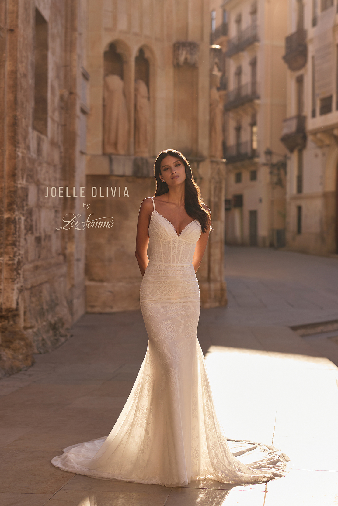 This net jersey and lace fit and flare gown exudes effortless romance with its corset-style bodice, delicate spaghetti straps, and soft V-neckline trimmed in lace. Sheer detailing and subtle ruching highlight the figure, while the low back and flowing train complete the look with timeless bridal elegance. Back zipper closure.