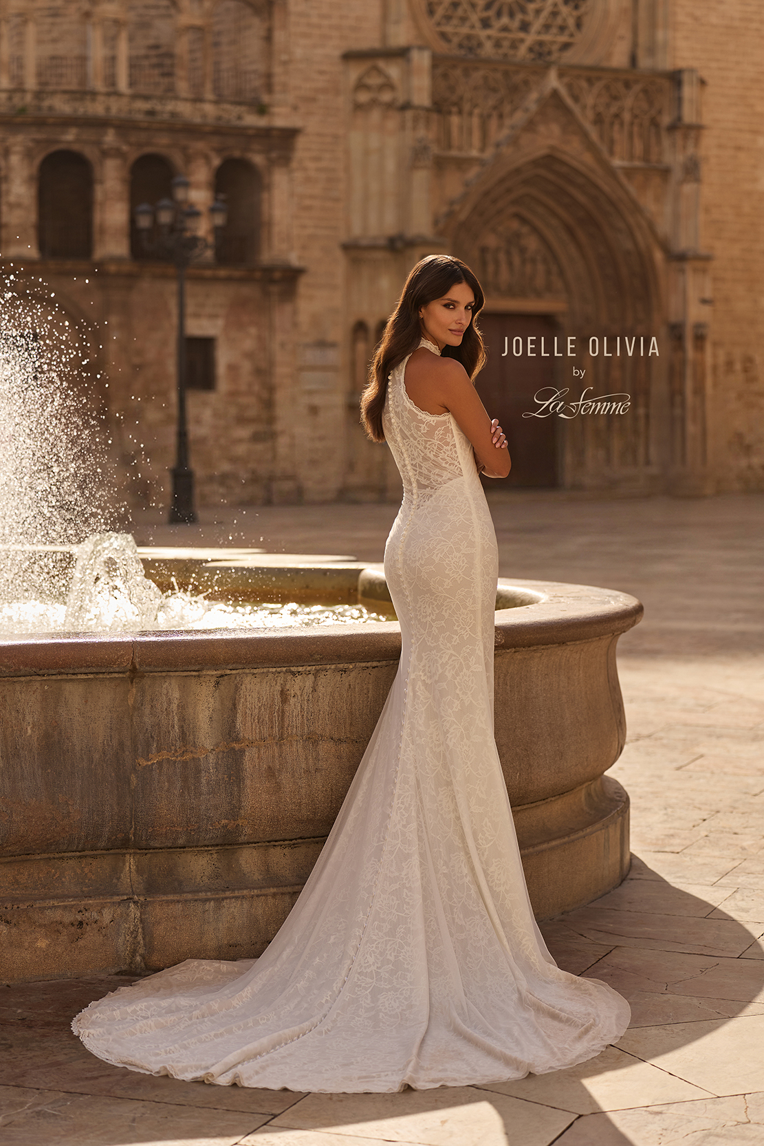 This elegant fit and flare gown features a high lace neckline for a sophisticated and timeless look. The allover lace design is complemented by subtle net jersey ruching that flatters the waist, while the sheer back with covered buttons adds a modern, romantic touch. A graceful train completes the refined silhouette. Back zipper closure.