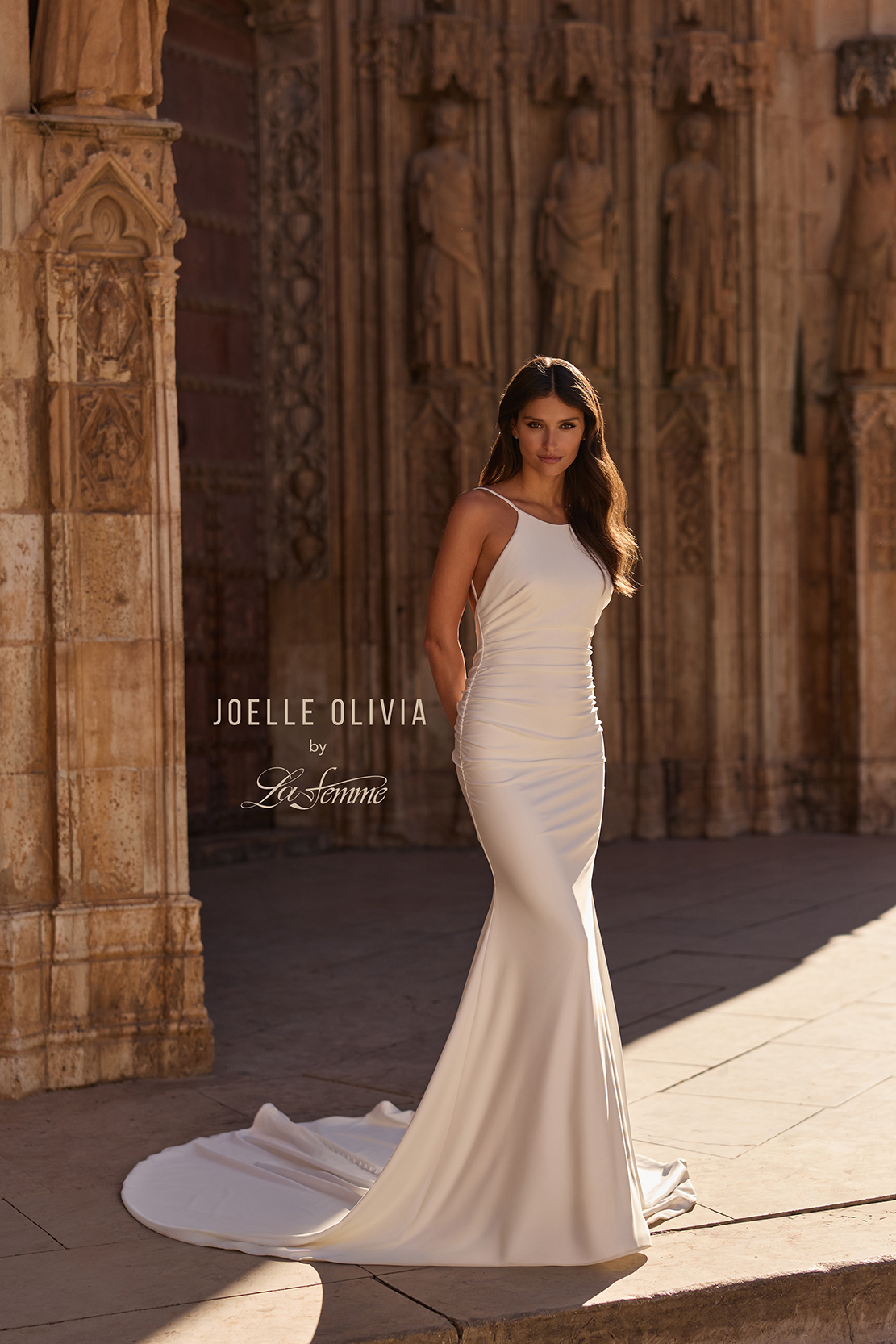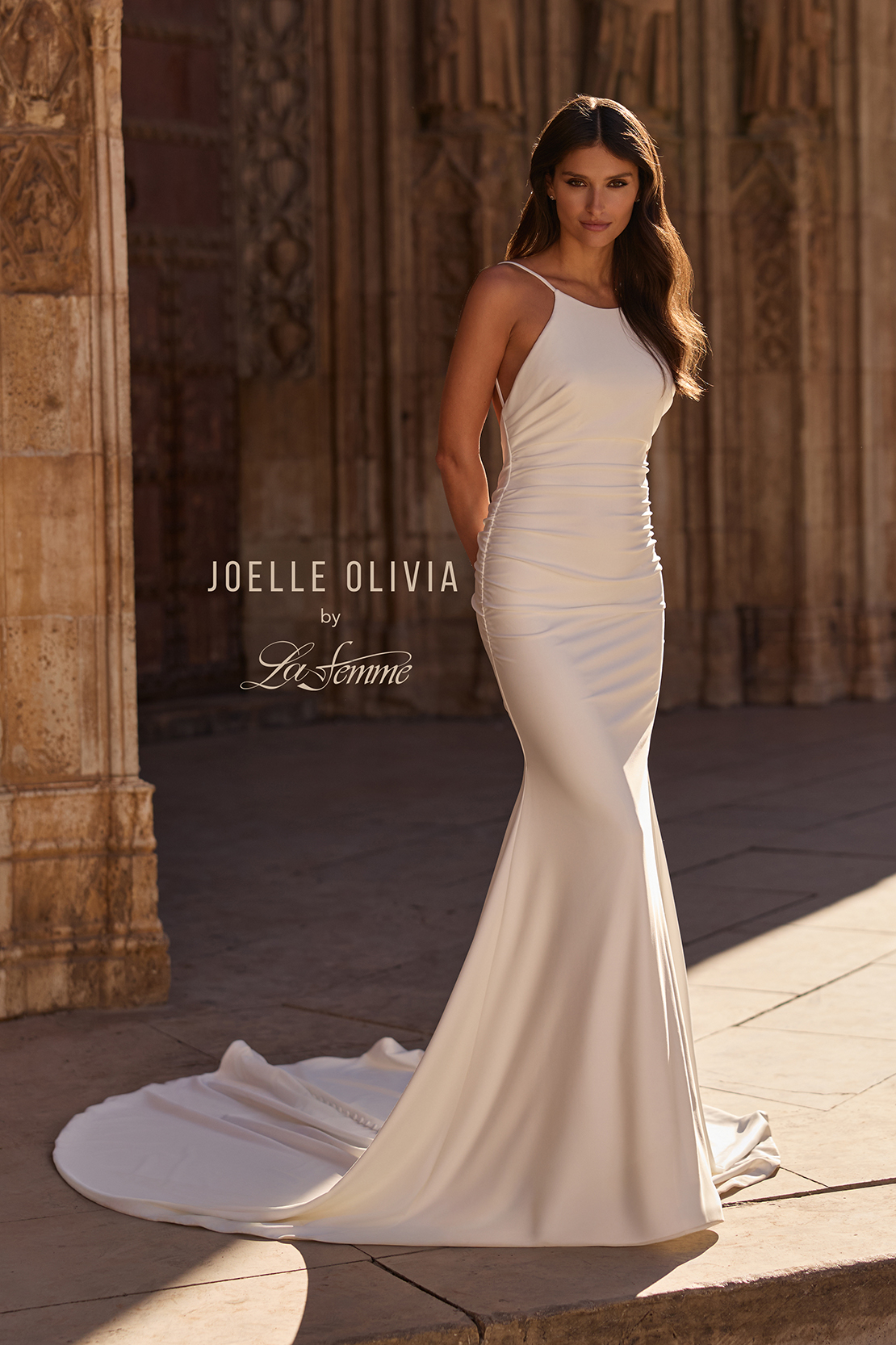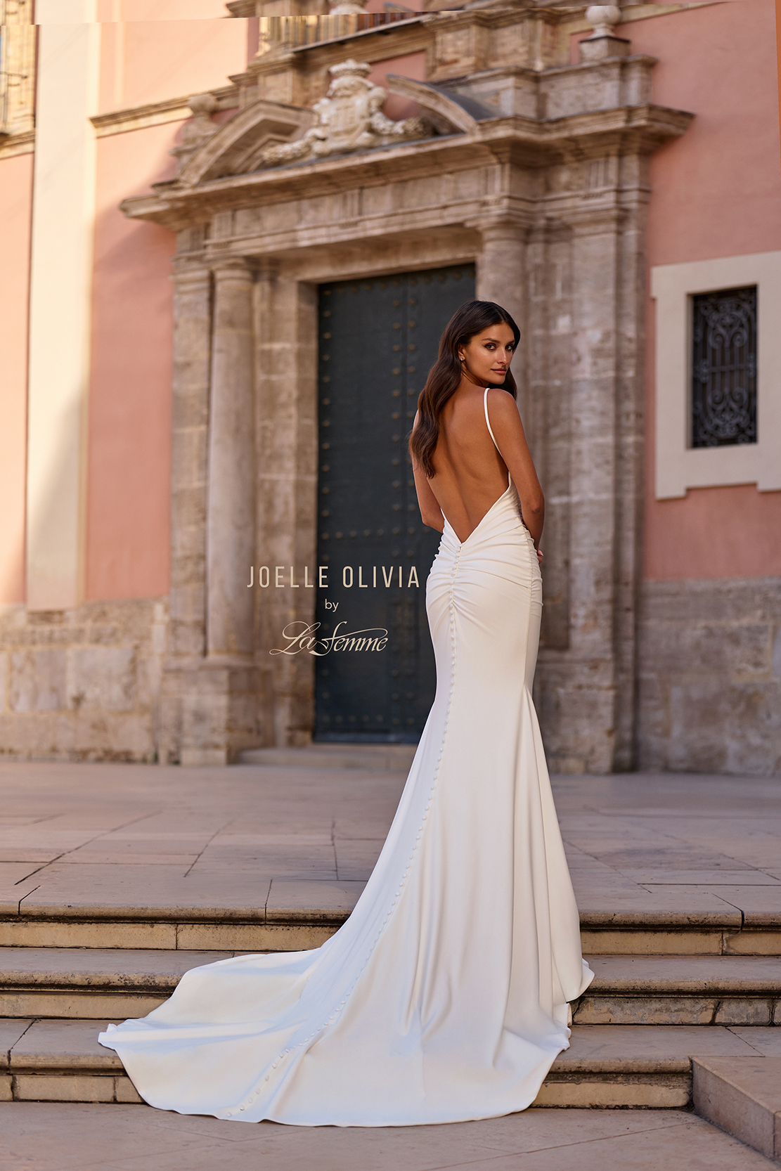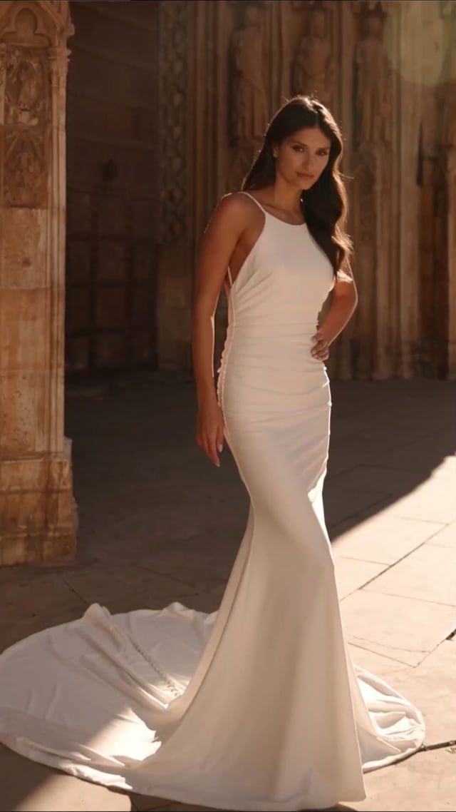 This minimalist fit and flare lux jersey gown features a modern halter neckline paired with a daring low open back. Soft ruching accentuates the hips for a flattering silhouette, while a row of delicate buttons trails down the skirt into a sweeping train. Perfect for the bride seeking chic, understated elegance. Back zipper closure.