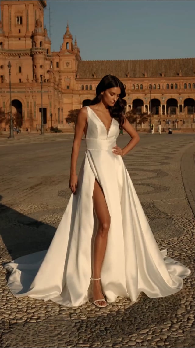 This modern mikado bridal gown features a plunging V-neckline with delicate eyelet trim and a flattering fitted waist. The flowing A-line skirt includes a daring high slit and a sweeping train for effortless elegance. Perfect for the contemporary bride seeking timeless sophistication with a touch of allure. Back zipper closure.