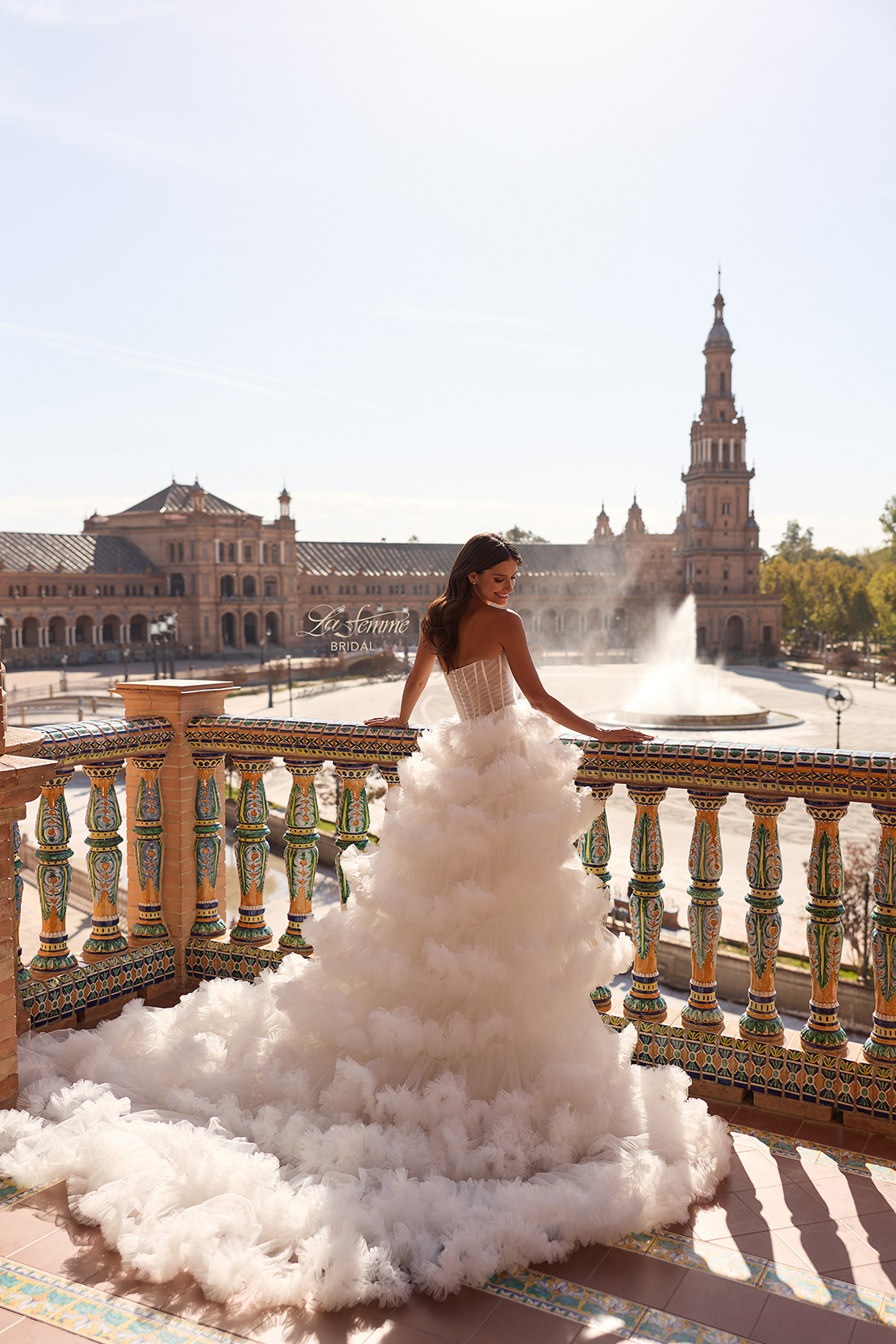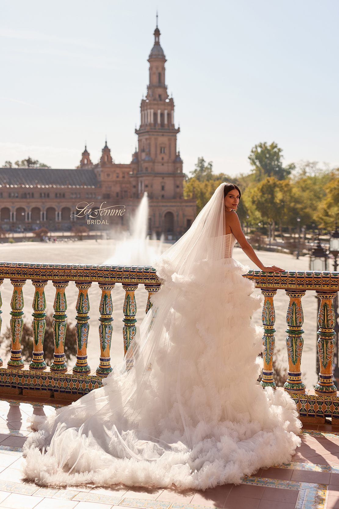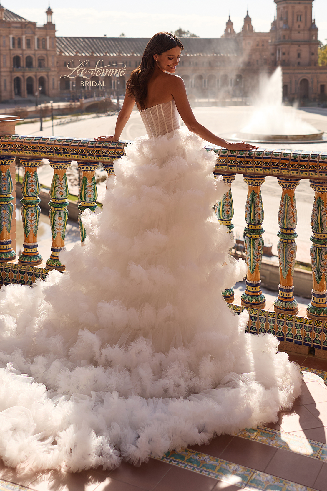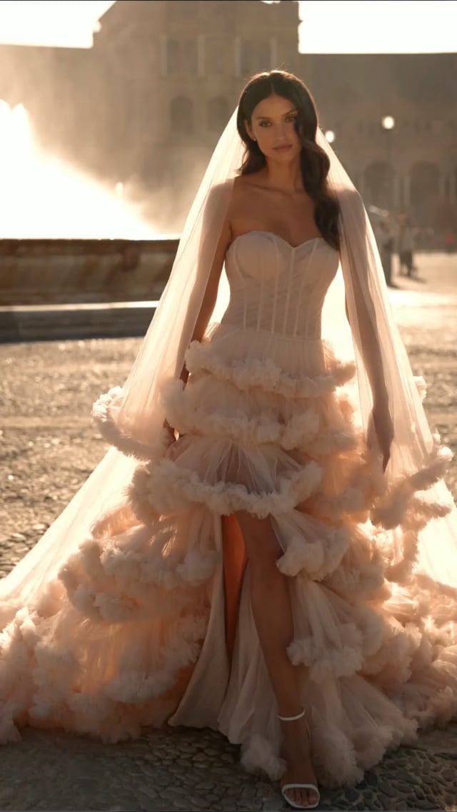 This breathtaking ball gown features a structured strapless corset bodice with exposed boning and a dramatic tiered ruffle skirt. Voluminous layers of soft tulle cascade into a flowing train, creating a show-stopping silhouette. A stunning choice for the bride who wants a romantic yet fashion-forward wedding day look. Back zipper closure.