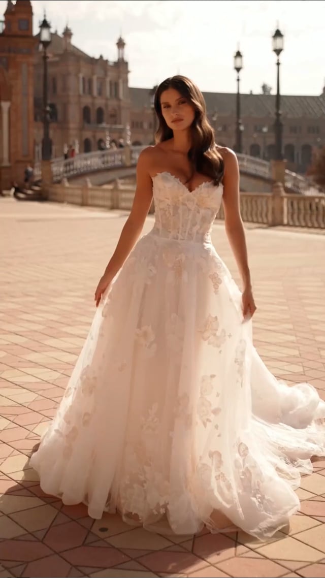 This enchanting A-line bridal gown features a strapless sweetheart neckline and a sheer corset bodice adorned with 3D floral lace appliqués. The soft tulle skirt flows gracefully into a chapel-length train, with delicate ivory and champagne embroidery creating a dreamy, romantic look perfect for any bride. Back zipper closure.